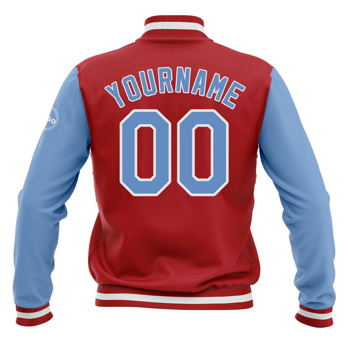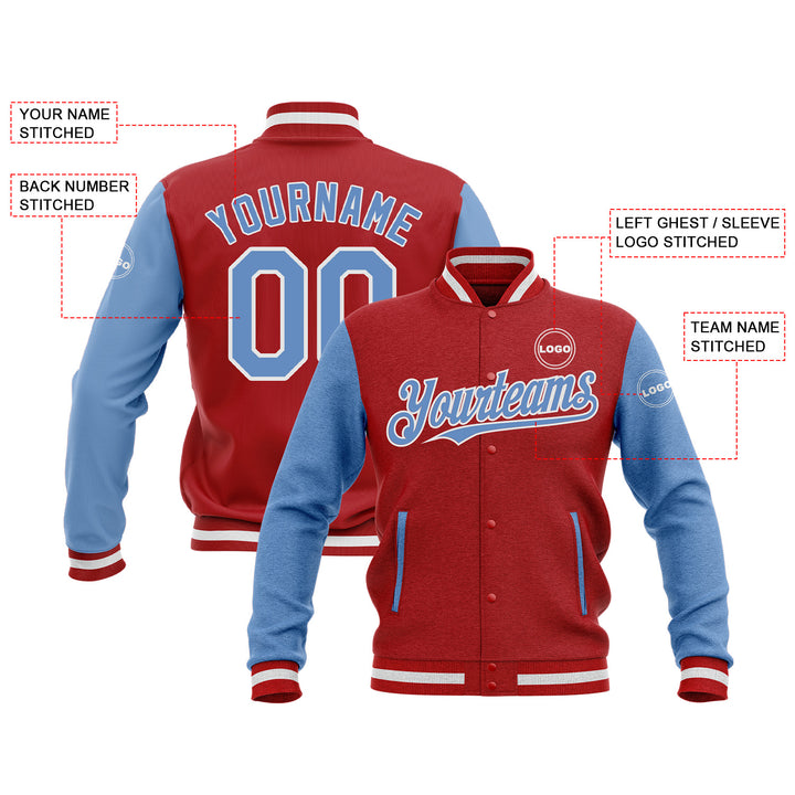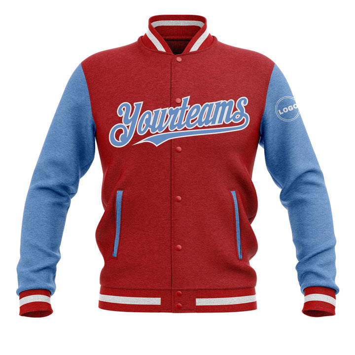 Custom Red Light Blue-White Two Tone Bomber Varsity Letterman Embroidered Jacket