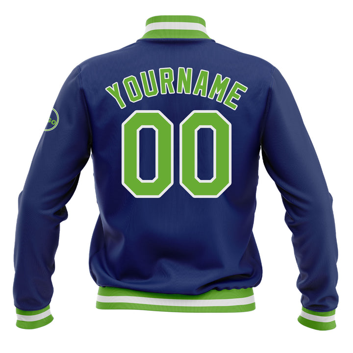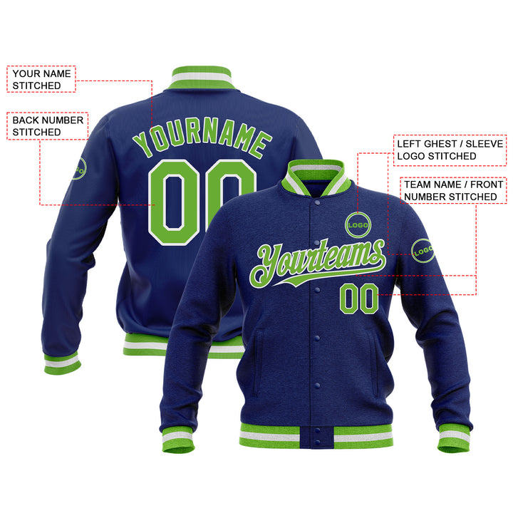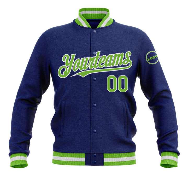 Custom Royal Neon Green-White Classic Style Bomber Varsity Letterman Embroidered Jacket