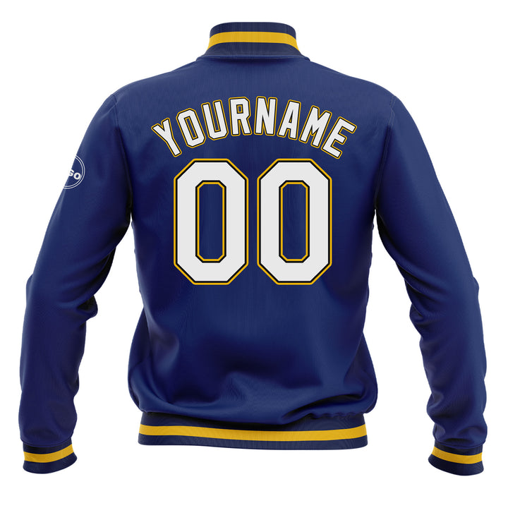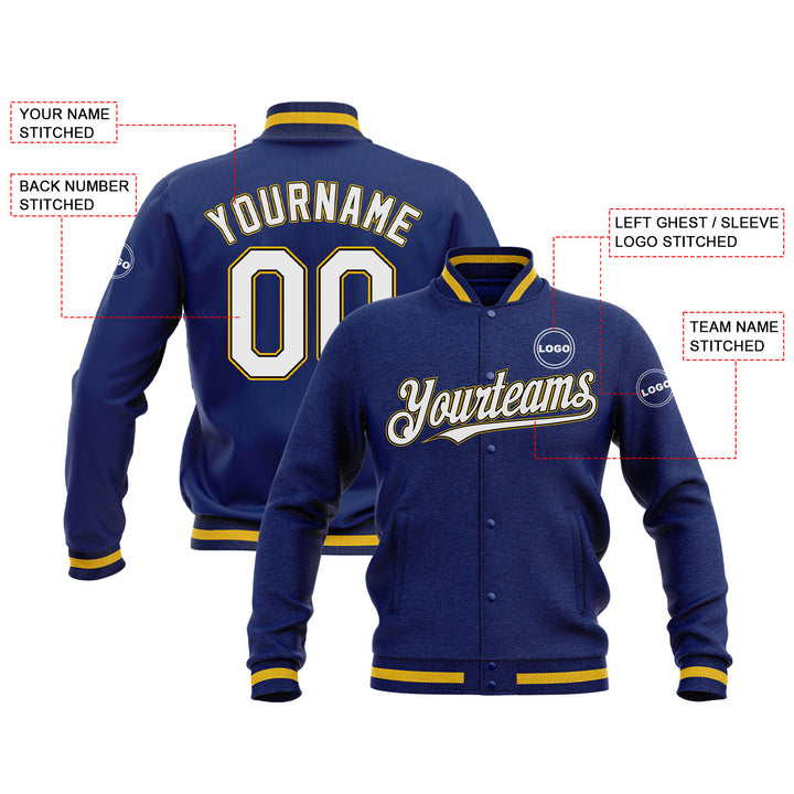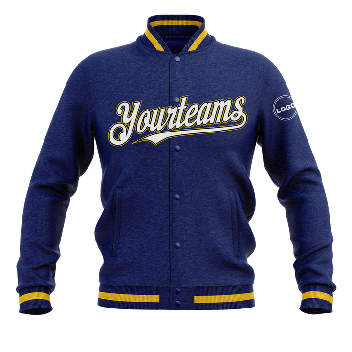 Custom Royal White Navy-Gold Bomber Varsity Letterman Embroidered Jacket
