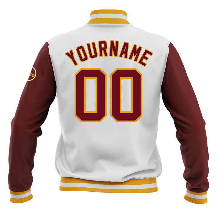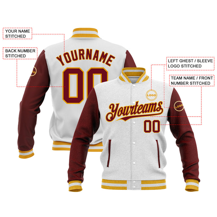 Custom White Crimson-Gold Classic Style Two Tone Bomber Varsity Letterman Embroidered Jacket