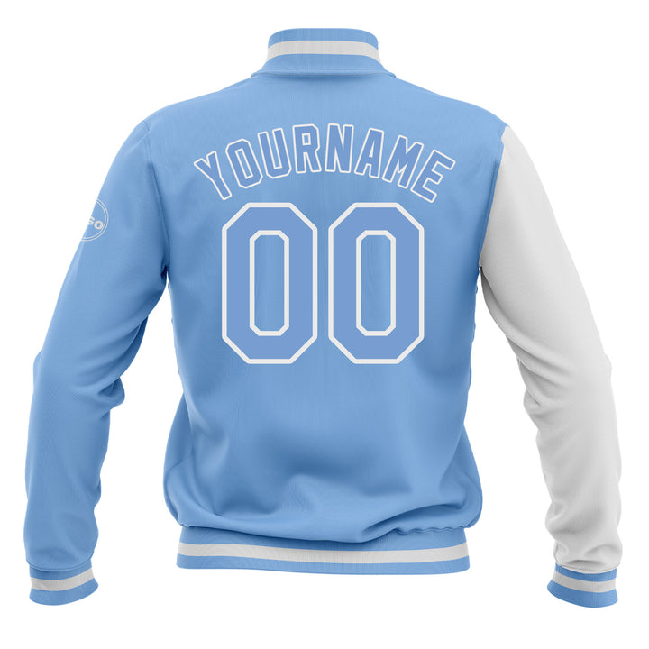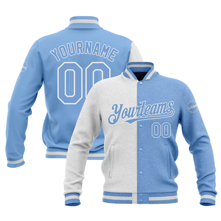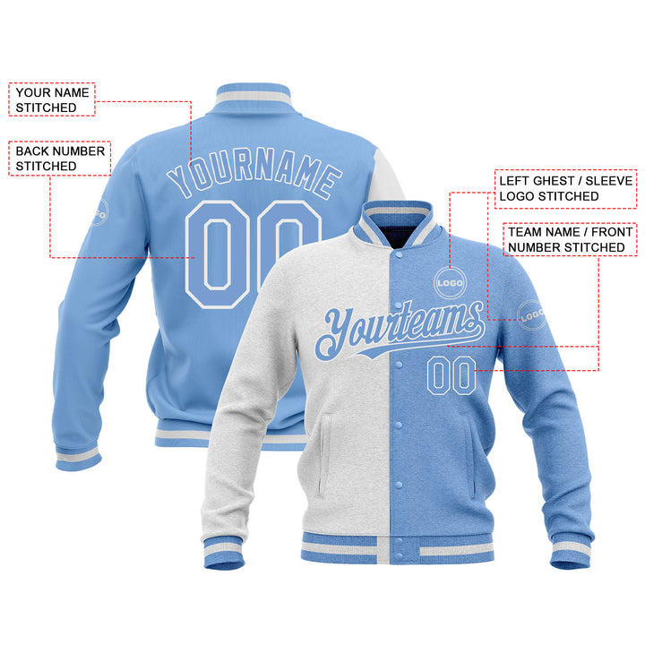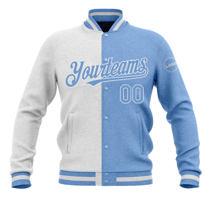 Custom White Light Blue Classic Style Split Fashion Bomber Varsity Letterman Embroidered Jacket