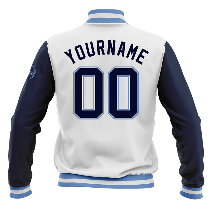 Custom White Navy-Light Blue Classic Style Two Tone Bomber Varsity Letterman Embroidered Jacket