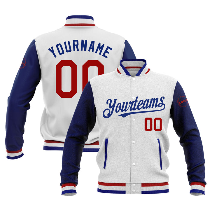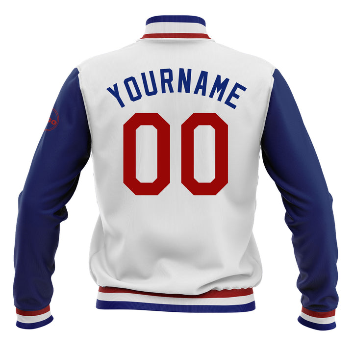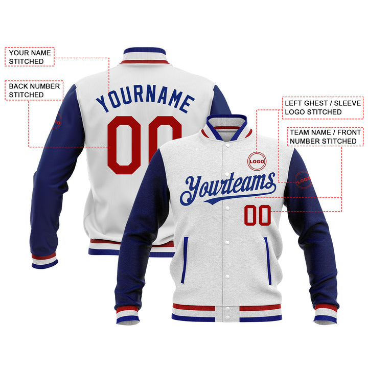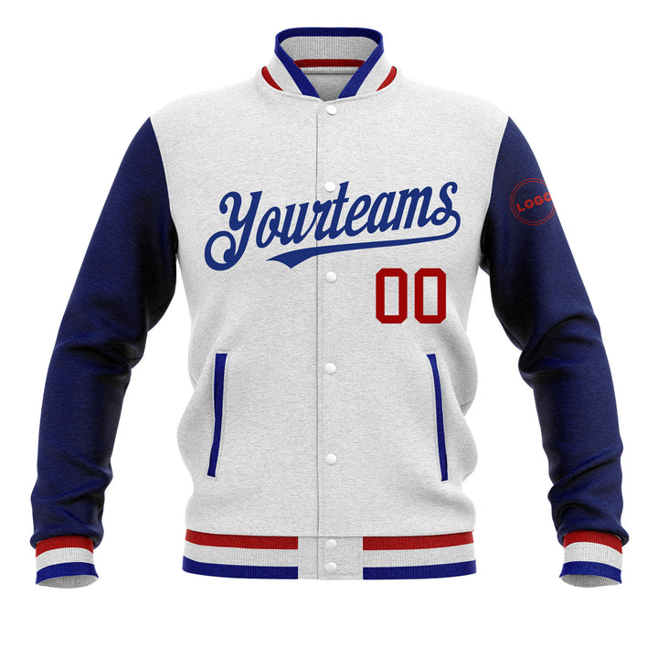 Custom White Red-Royal Classic Style Two Tone Bomber Varsity Letterman Embroidered Jacket