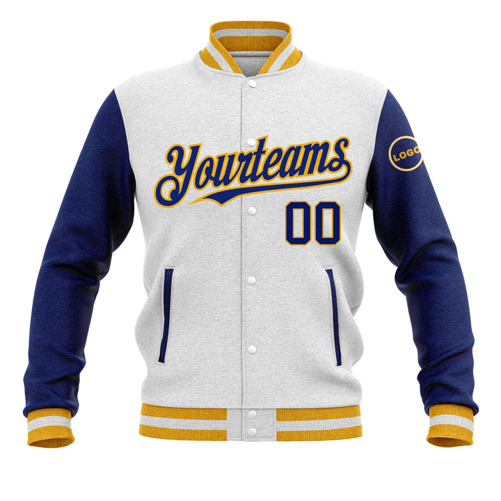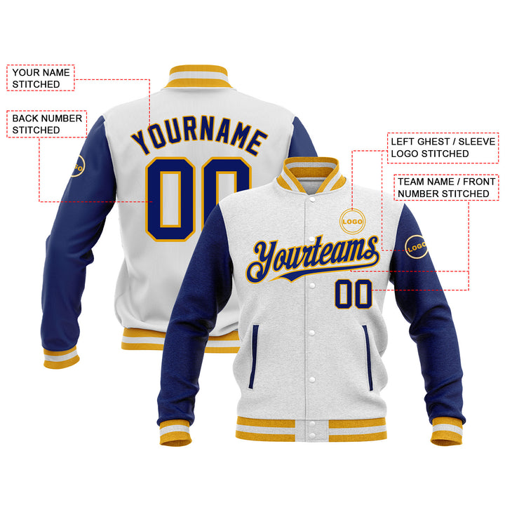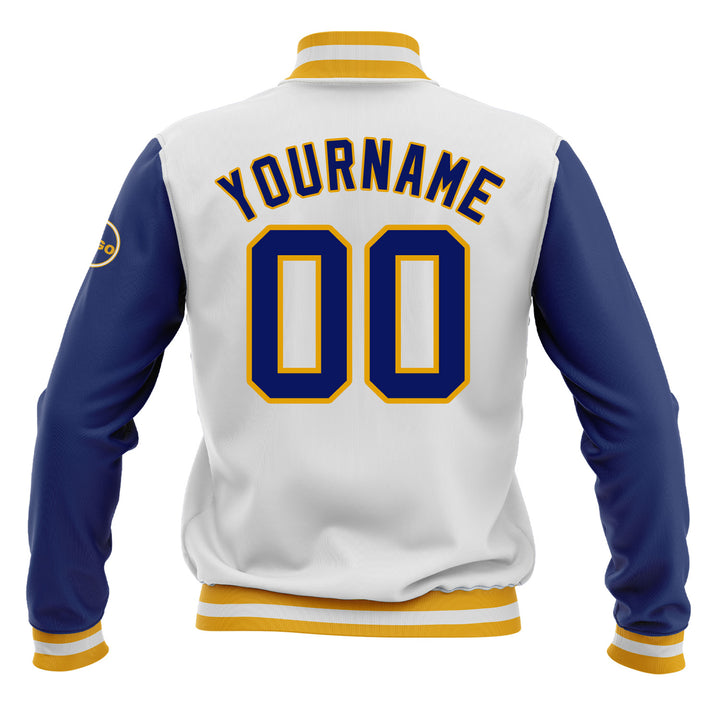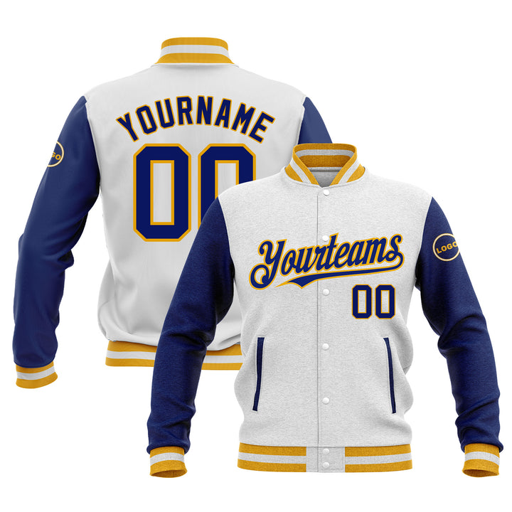 Custom White Royal-Gold Classic Style Two Tone Bomber Varsity Letterman Embroidered Jacket